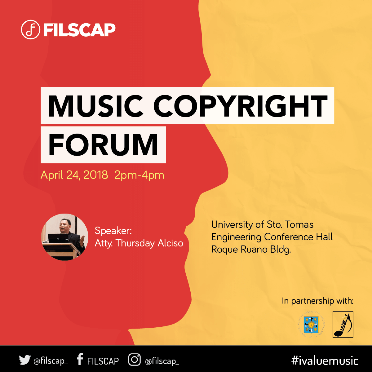 Attention, Thomasians! As we celebrate the Intellectual Property Rights (IPR) month, we will be having a Music Copyright Forum on April 24 (Tuesday) from 2:00 PM to 4:00 PM at the UST Engineering Conference Hall, Roque Ruano Bldg.