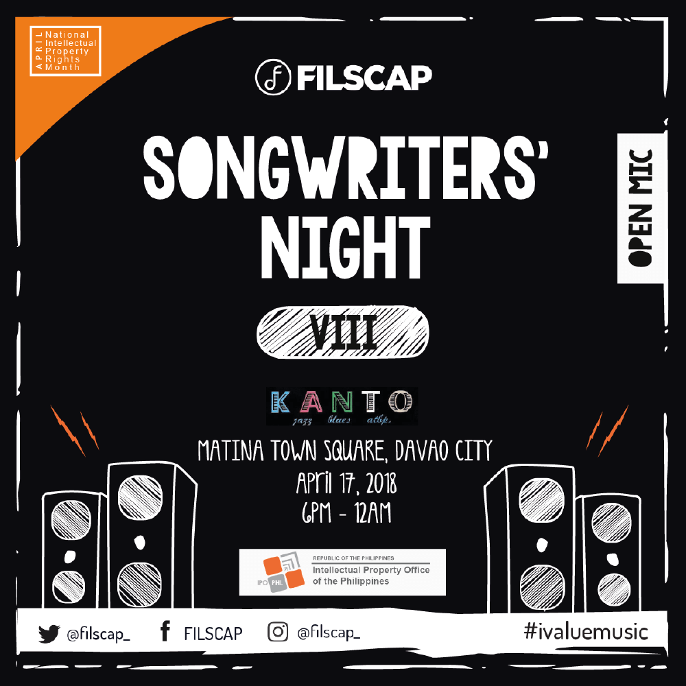 In celebration of the National Intellectual Property Rights Month, FILSCAP is bringing the Songwriters' Night (Open Mic) event to Kanto Bar at Matina Town Square, Davao City on April 17, 2018!